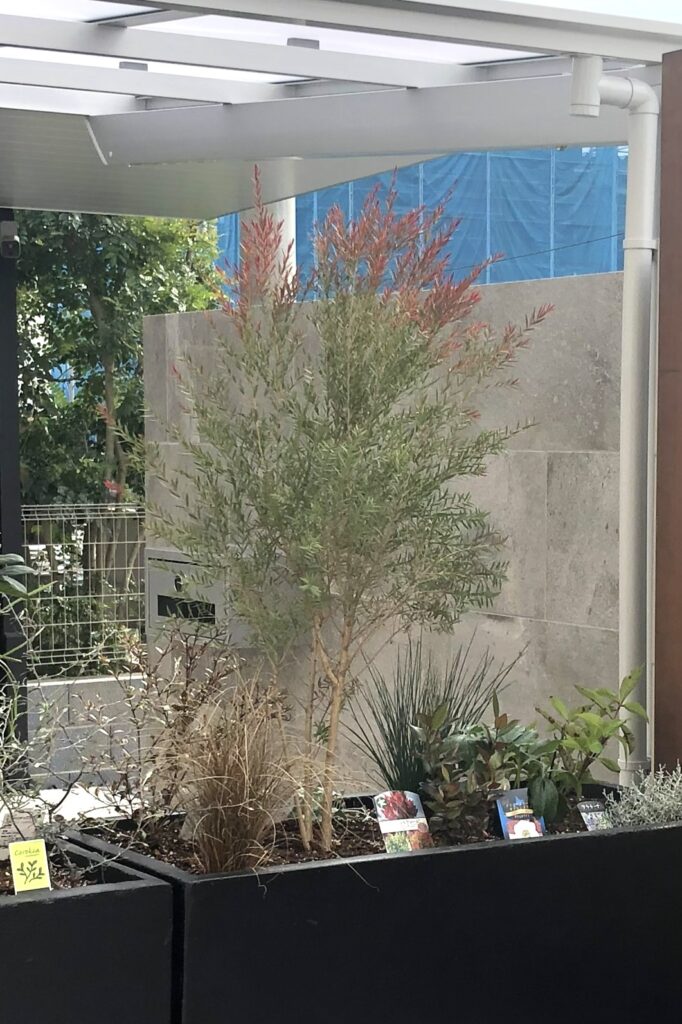 ティーツリーの近似種で葉は非常によく似ていますが、ブラシノキの特長はその花です。夏にボトルブラシのような形の真っ赤な花を咲かせます。