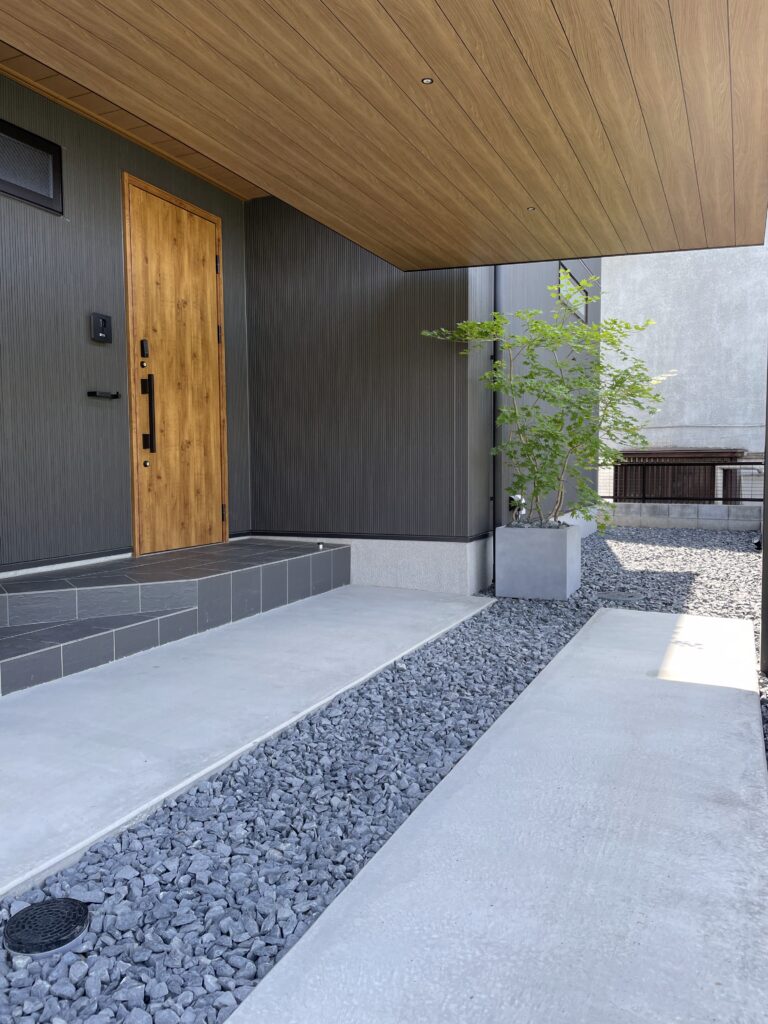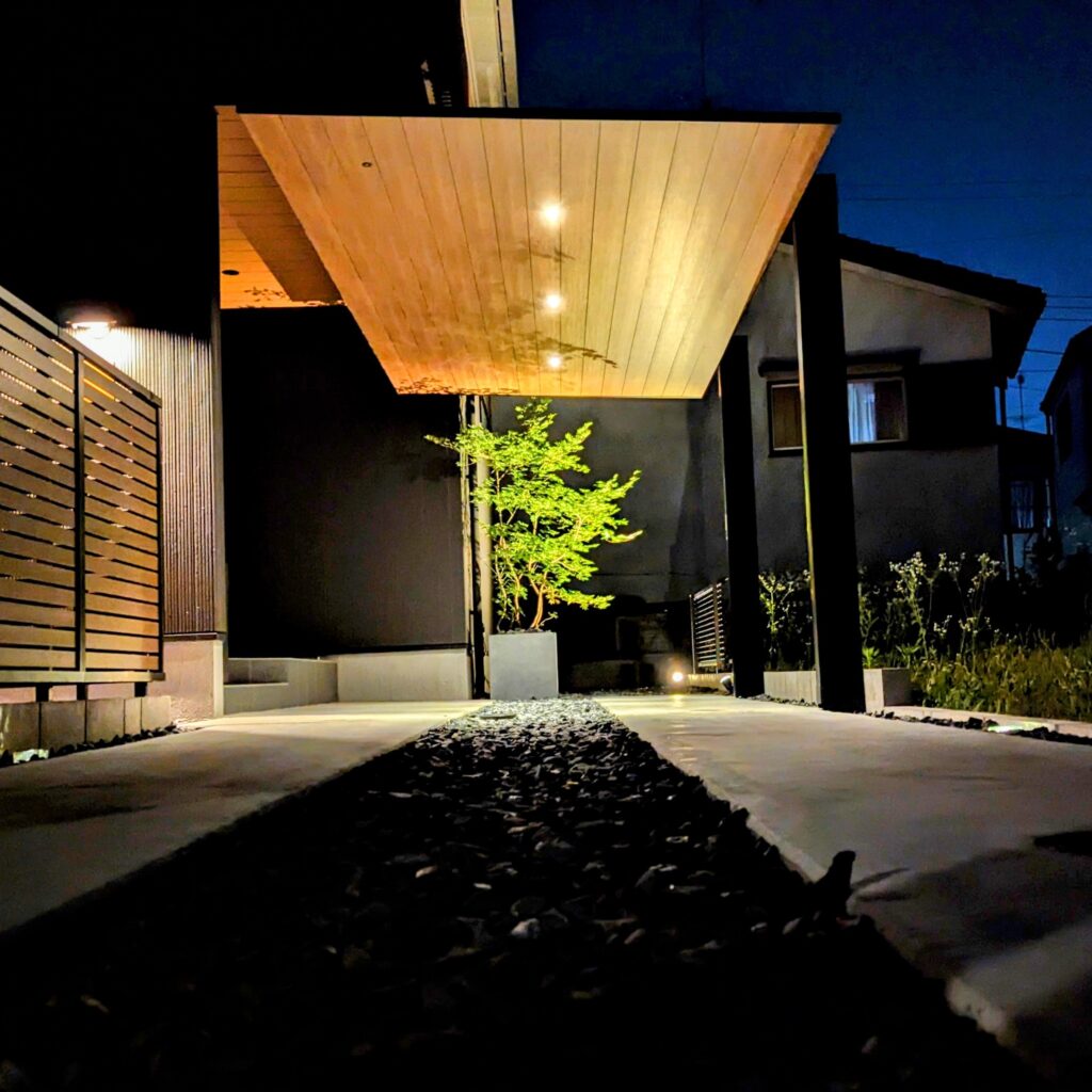 モルタルテラスは出入りがしやすいように、掃き出し窓のサッシ下まで高さを上げました。基礎の水切りを塞がない工夫もしっかり考えてあります。前面道路から轍コンクリートでつなげた建物正面は、オプション照明を入れたLixilのカーポートSCと大型のグレープランターが存在感を示しています。
