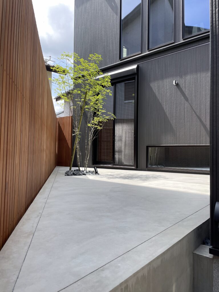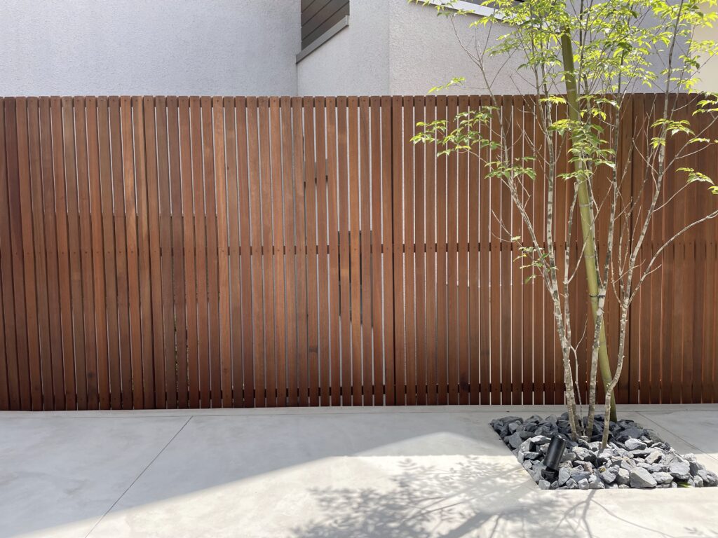 庭の構成要素は、ウリン材のウッドフェンスとモルタルテラス、植栽のみ。これ以上ないシンプルな構成です。まわりの無駄を削ぎ落とすことで、樹木の季節ごとの変化や表情がより際立って見えます。ウッドフェンスは高耐久のウリン材で造作しました。プライベート感のある仕様となっています。