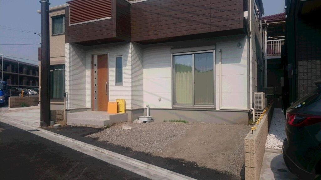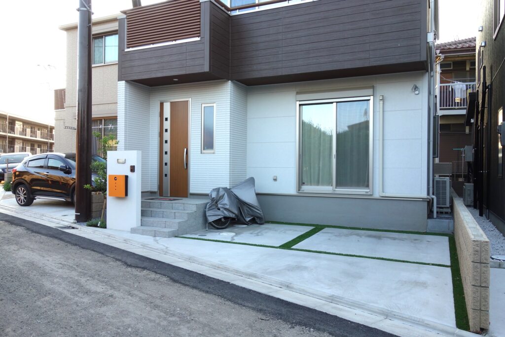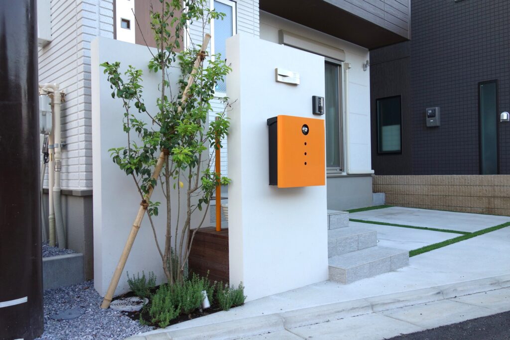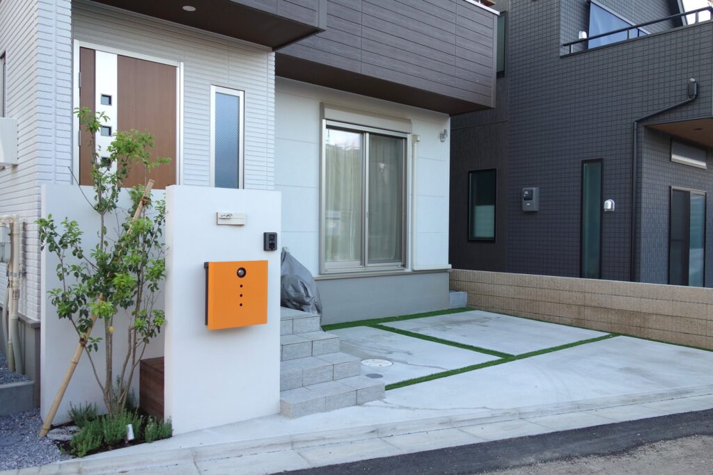 駐車場1台分のシンプルなオープンエクステリアです。門柱はジョリパット左官仕上げ。1階部分の外壁に調和するカラーリングです。オレンジのポストは、ビビットながらも程よい色合いで空間に馴染んでいます。もともと立水栓があった場所を数台分の自転車置場にするため、門柱背後のスペースを工夫し新たにスリムな立水栓を設置しました。色はポストとお揃いで、さりげなく統一感を演出しています。