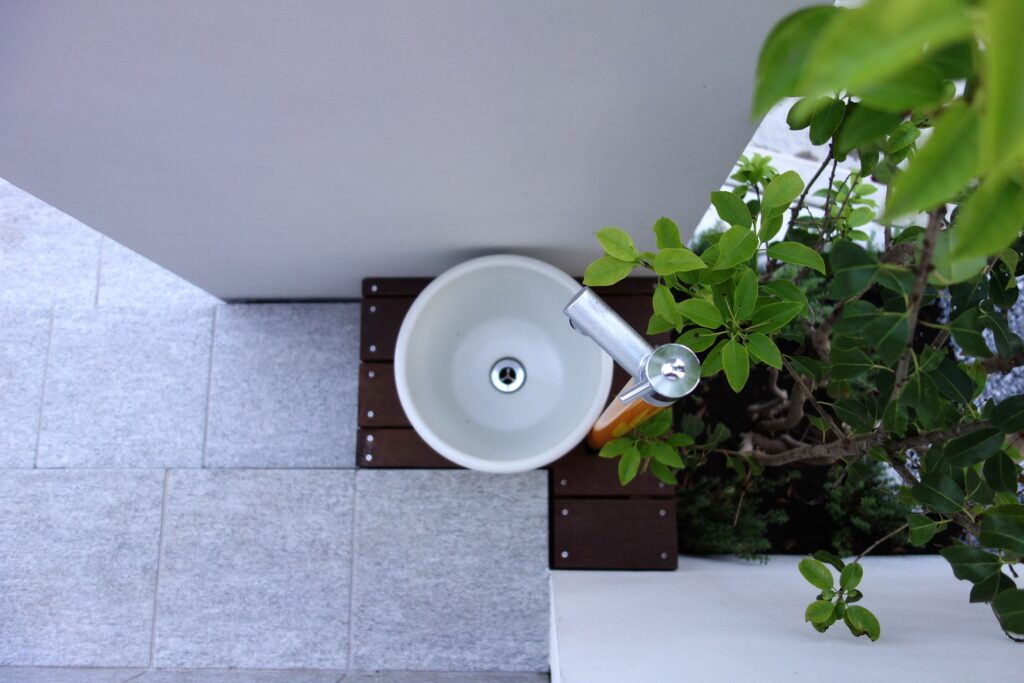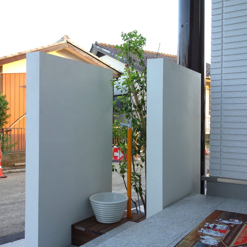 ウリン材で造作したミニデッキは立水栓の配管を隠すためのものなのですが、その素材感が植栽との相乗効果でこの空間の質をワンランク上に引き上げています。植栽の背後には門柱同仕様の壁を設置。植栽の背景となるのはもちろんのこと、玄関の目隠し、少し高い位置にある玄関ポーチからの転落防止機能も併せ持っています。