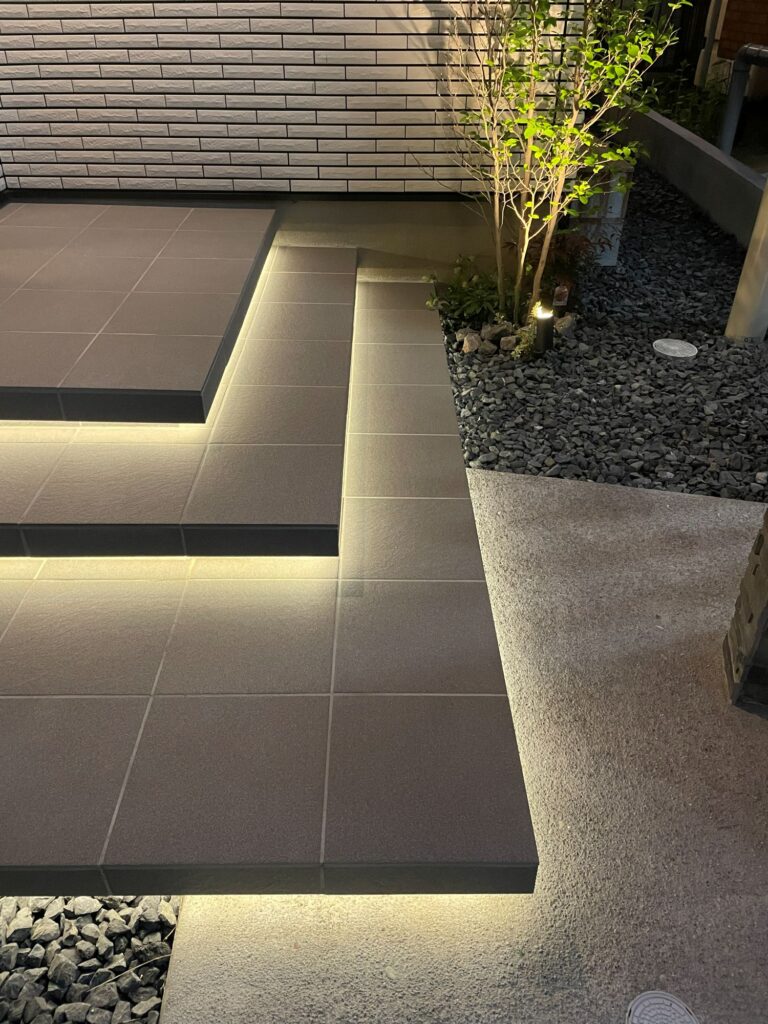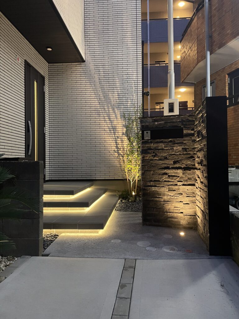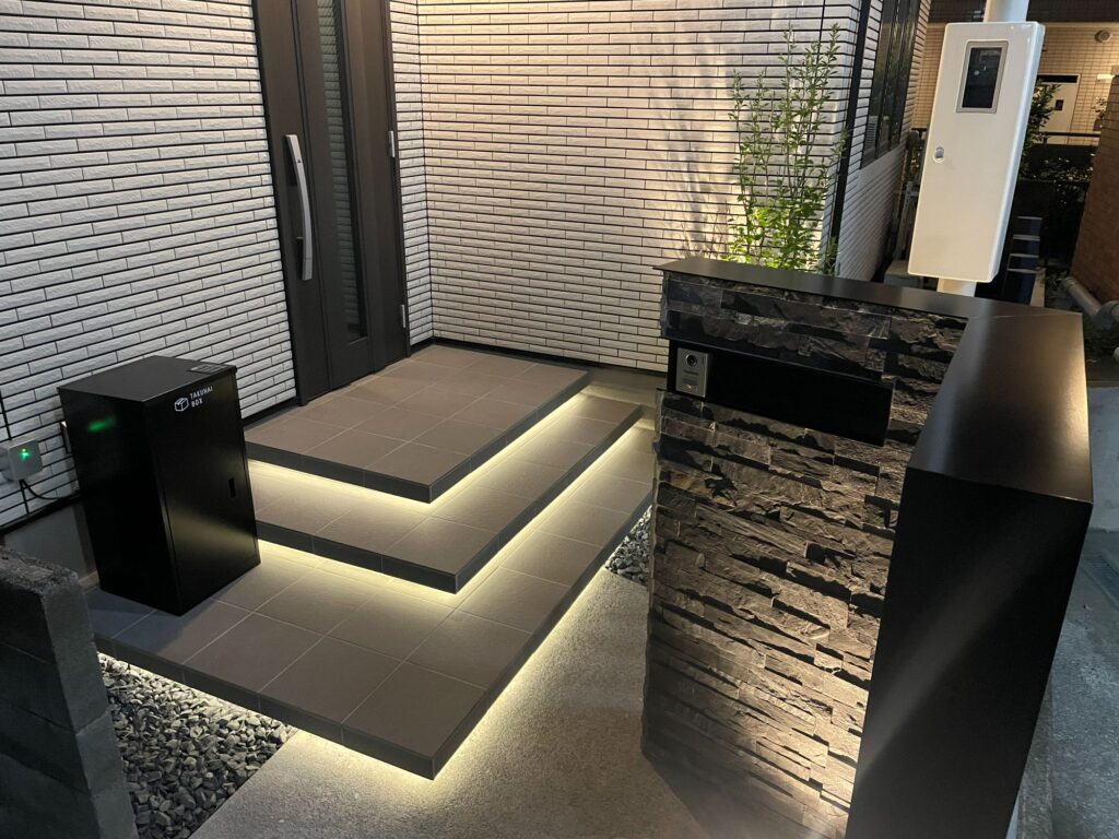 毎日のご帰宅が遅い施主様のために、特別なエントランスをご用意しました。疲れて帰ってきた時でもテンションの上がる間接照明を、タイルの浮き階段と組み合わせデザインし、宅配ボックスも使いやすい位置に設置しました。門柱は本物の石張り仕上げ。ブラック焼付塗装のフラットなアルミ笠木と側枠により、グレーの凹凸のある天然石がより引き立っています。