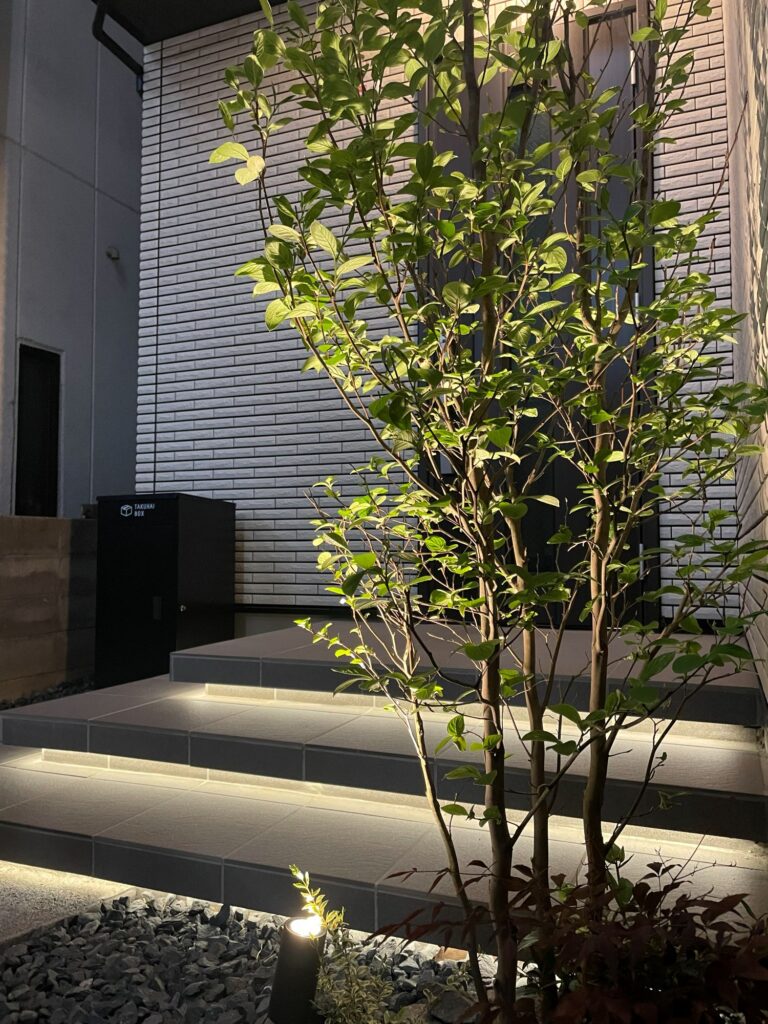 シンボルツリーは落葉樹のシャラノキ。落葉樹を1本植えるだけで季節感を楽しめます。冬期の寂しさは根元に植えた常緑のナンテンオブセスとクリスマスローズがカバーしてくれるでしょう。季節により表情を変える樹木や草花の姿と、夜の間接照明により、毎日通るのが楽しみになるような特別感のあるエクステリアです。