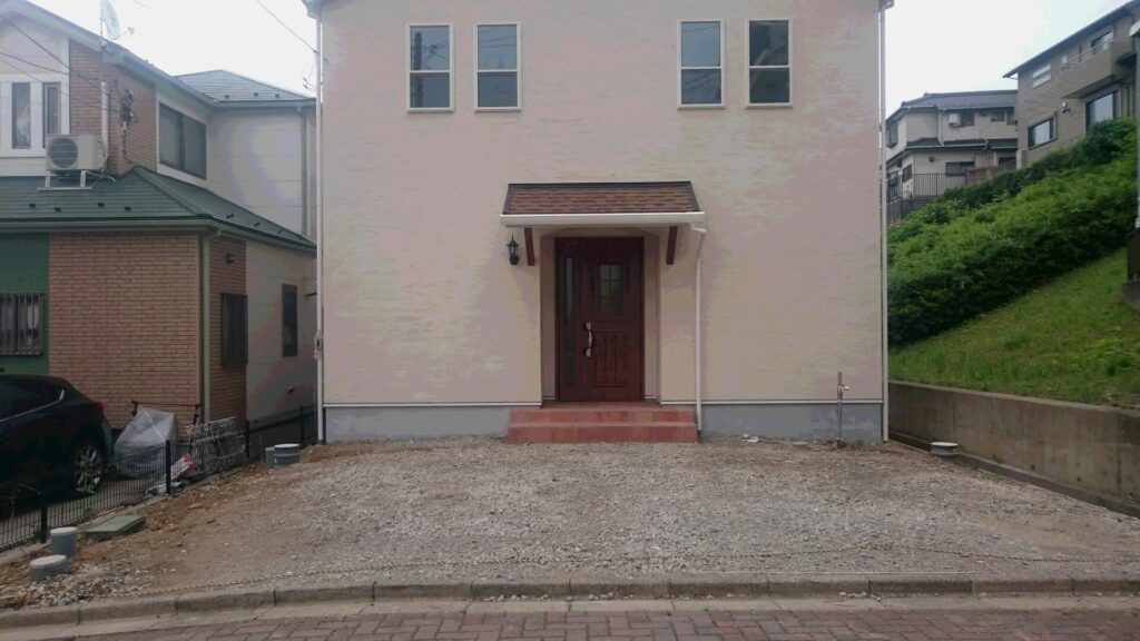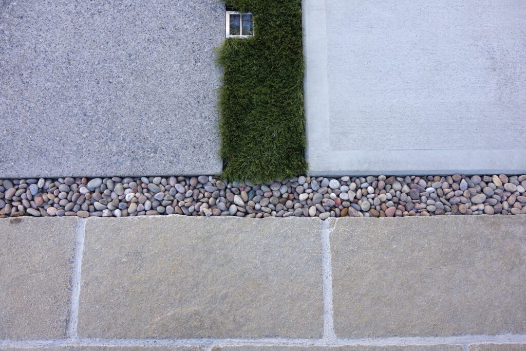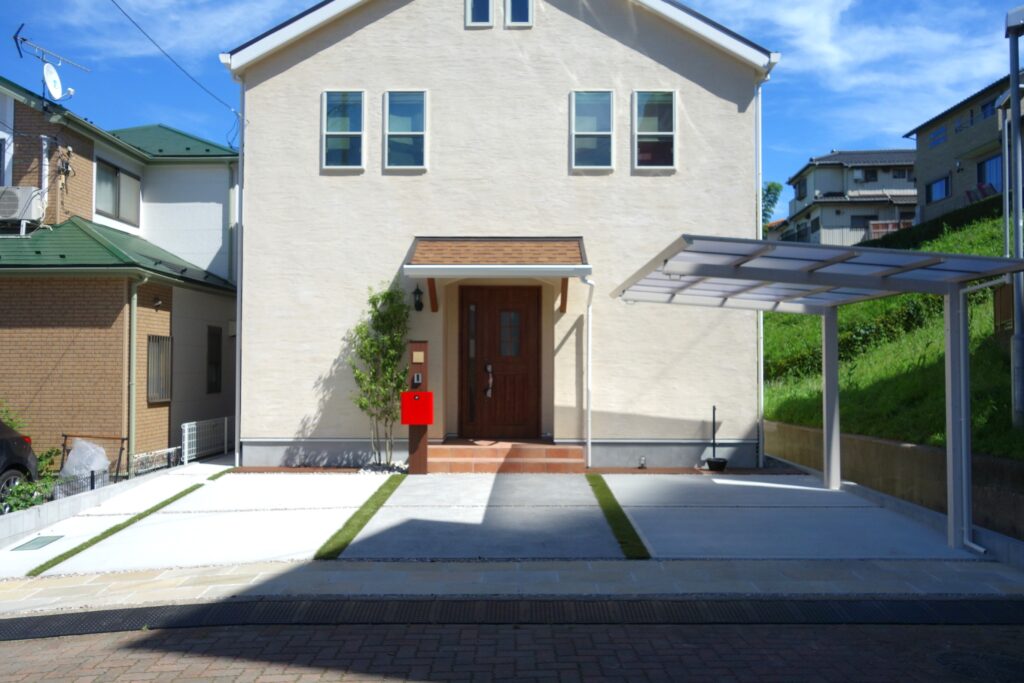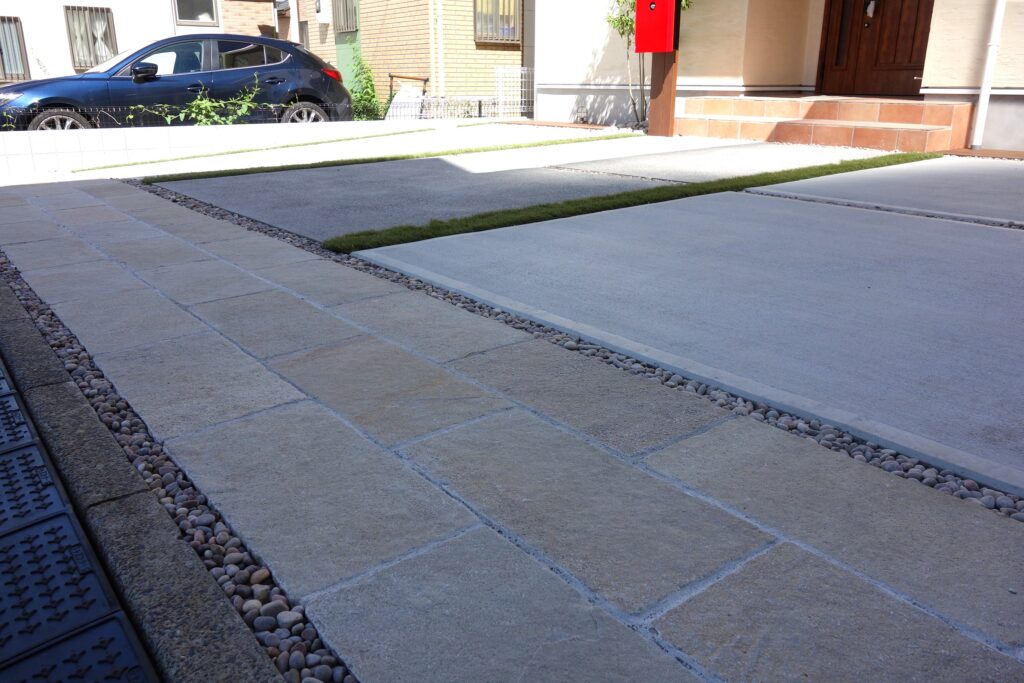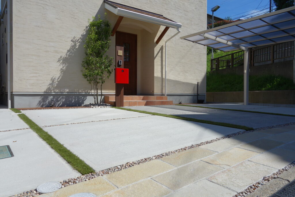 シンプルでナチュラルな建物に合わせたオープンエクステリアです。敷地入口部分はエクステリアのコンセプトを表現するために、思い切って端から端までライムストーンの天然石で仕上げました。淡いイエローが優しい表情の天然石です。中央のアプローチ部分は洗い出し仕上げとなっていて、それぞれの目地には化粧砂利と芝目地が入っています。駐車場コンクリートの冷たくて無機質なイメージを軽減させるために明るくて優しい素材を選びました。