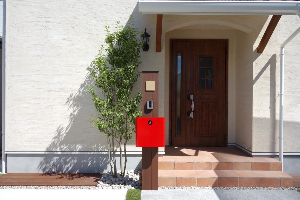 玄関前には木目調の機能門柱を設置。ポストのビビットな赤が差し色となって空間にアクセントを与えています。玄関ポーチの両サイドは貴重なサービススペース。ウリン材でグランドデッキを造作し、左側にはシンボルツリーのソヨゴ、右側にはマリンランプ照明とブラックブロンズメッキの立水栓を入れました。機能的で建物に調和したシンプルナチュラルなエクステリアです。