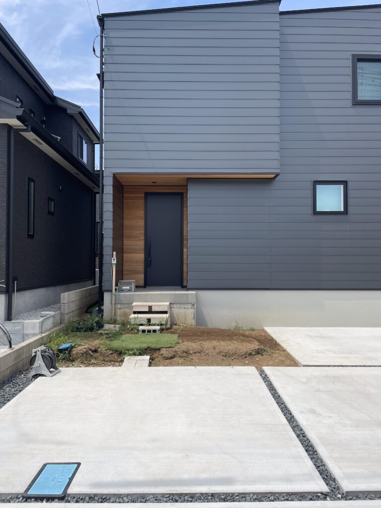 ブラックの機能門柱は玄関ドアとリンクしていて、濃色が空間を引き締める効果を生み出しています。とかく単調になりがちな玄関前の階段スペース。車、自転車、そして特に人の動線を何パターンも想定して使い勝手を考えることで、機能性を損なわず空間に変化を付けることができます。