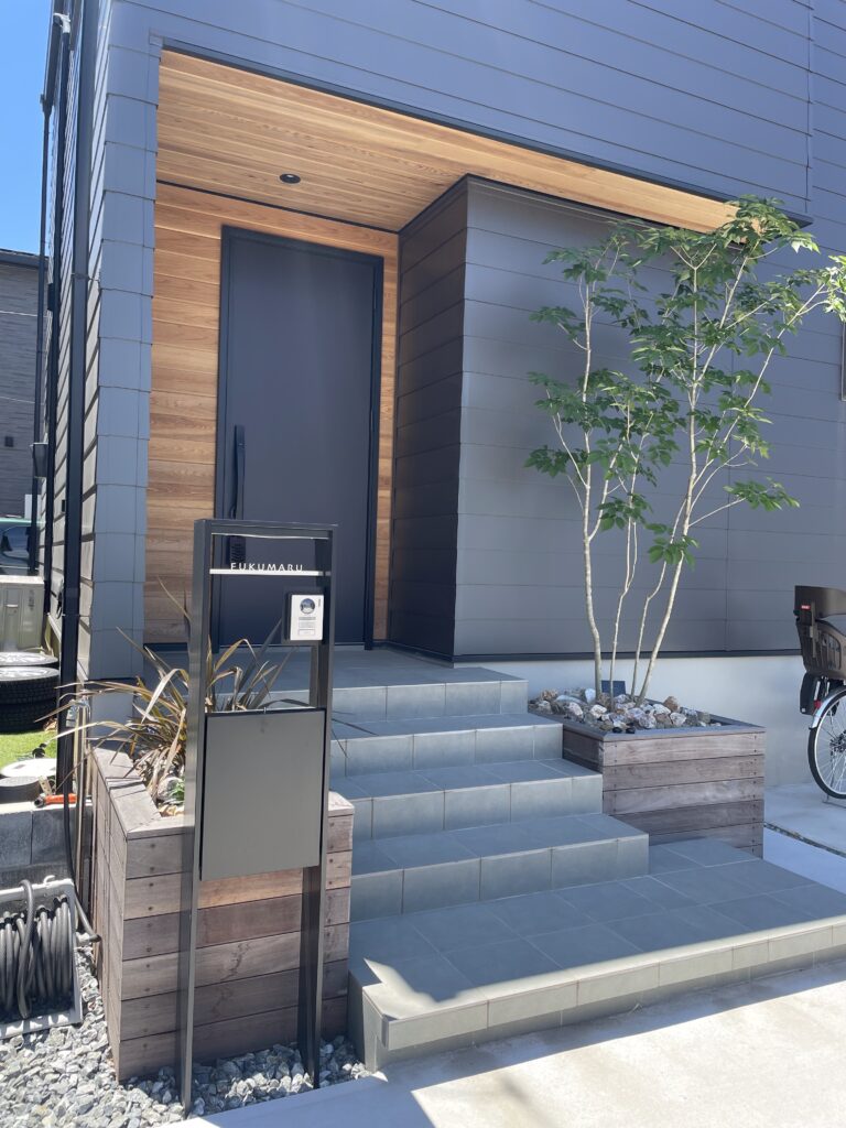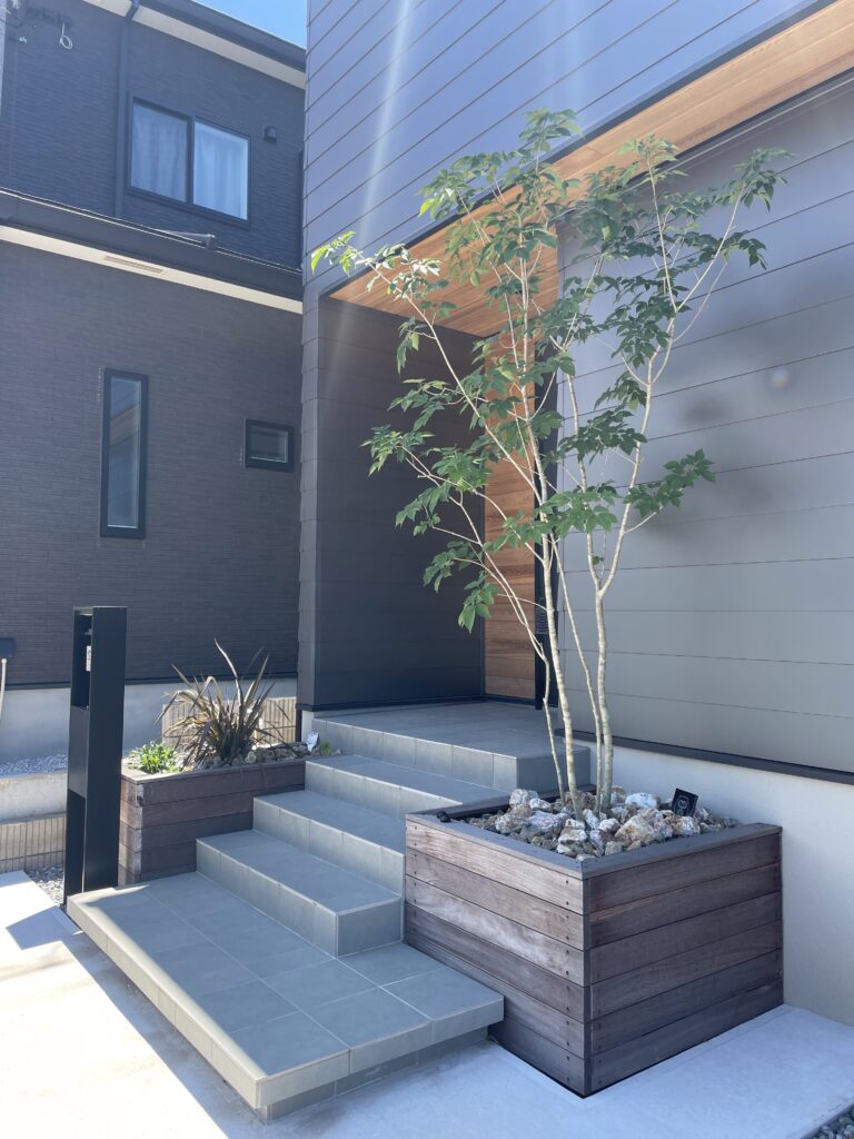 玄関前の階段スペースを工夫したエクステリアです。浮き階段にして変化を付けた1段目は二方向からの動線に対応。右手に広げた分生まれた奥のスペースには植栽花壇を設け、シンボルツリーのアオダモを植え込みました。2,3,4段目は機能的に必要な幅はしっかりキープしつつ左手を縮小することで、こちら側にも花壇スペースを配置しています。